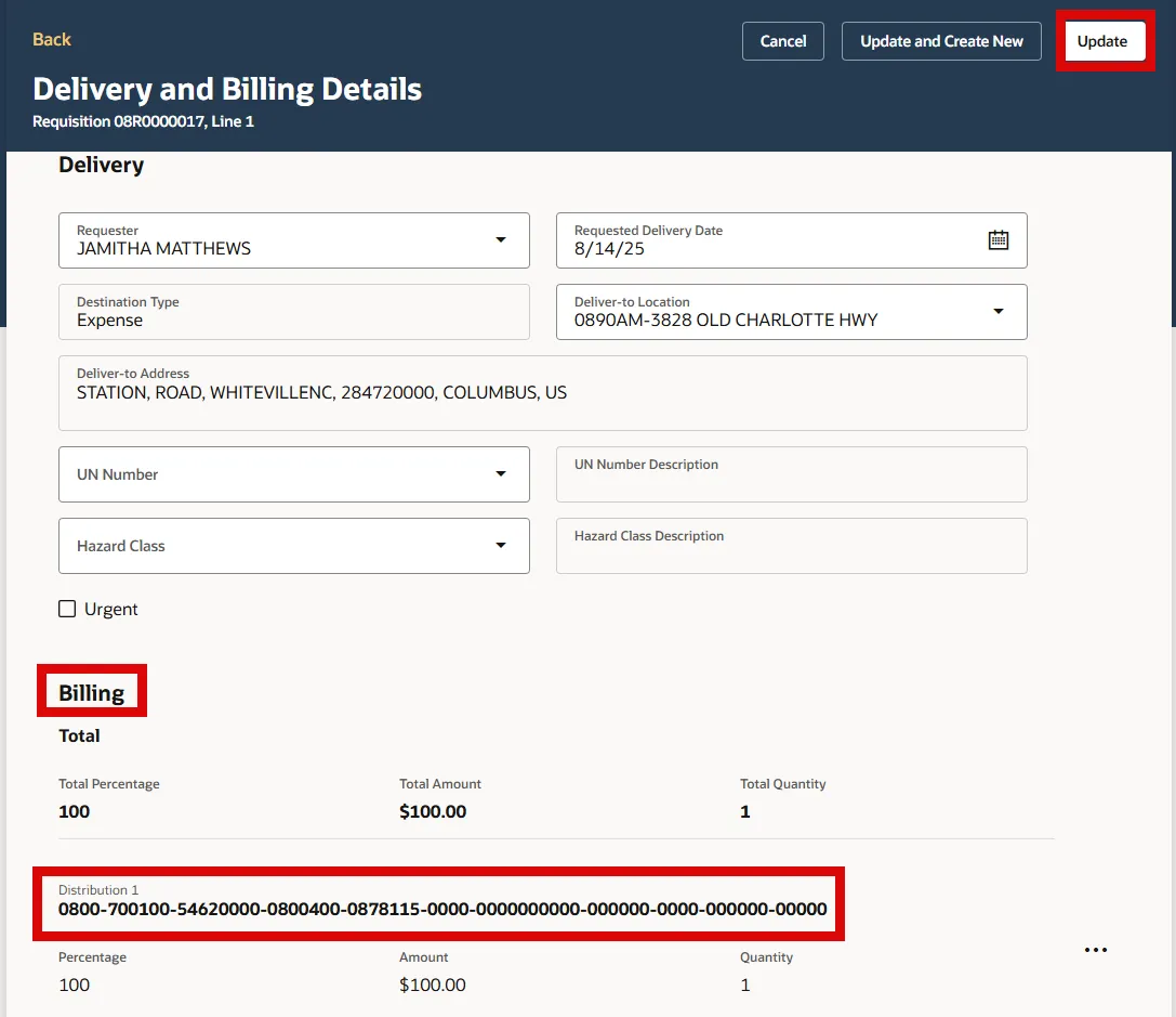 Step 23. The Accounting Distribution will now show under the Billing section, select the Update button to continue.