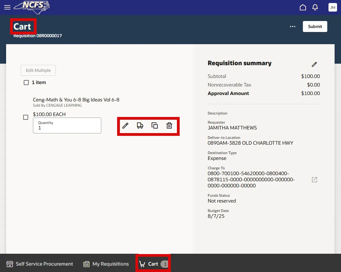 Step 24. In the Cart section, verify all Requisition Order details prior to submitting.