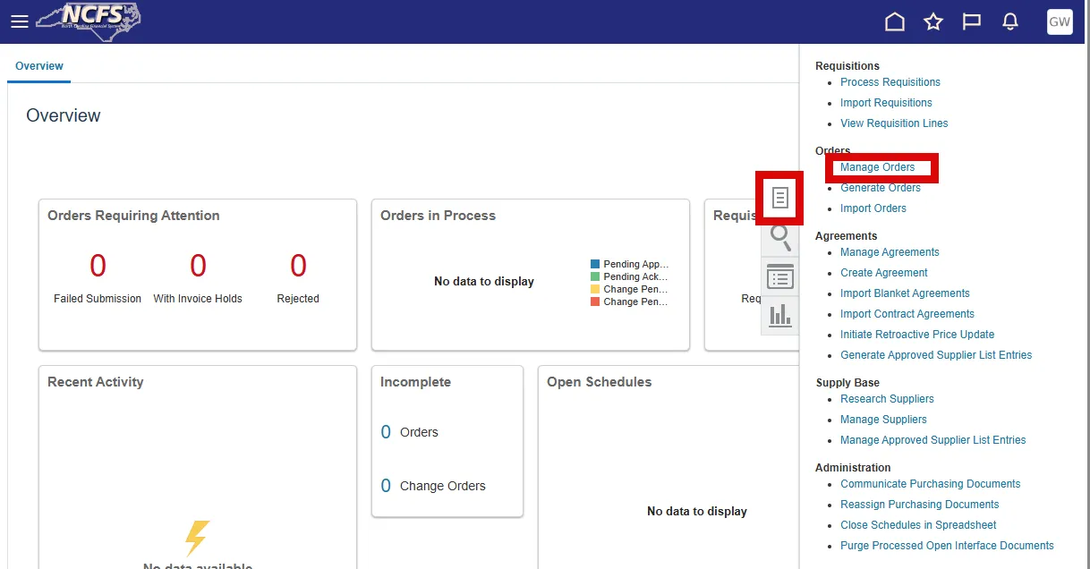 Step 3. Select the Tasks icon menu and select Manage Orders.