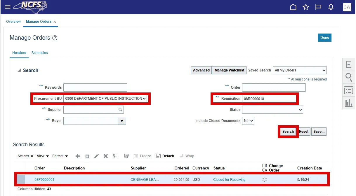 Once the requisition is approved the purchase order will automatically be generated. Follow these steps below to review the purchase order in NCFS.