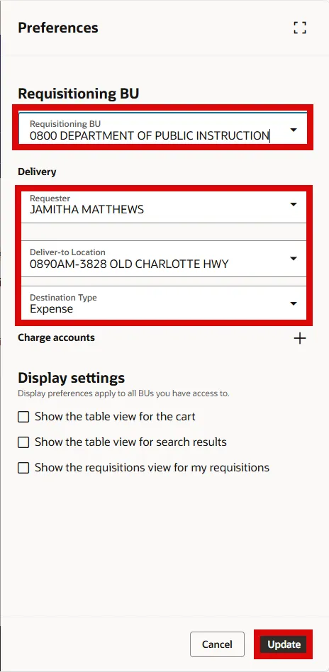 Step 4. On the Preferences page, enter the 0800 Department of Public Instruction in the Requisition BU field.