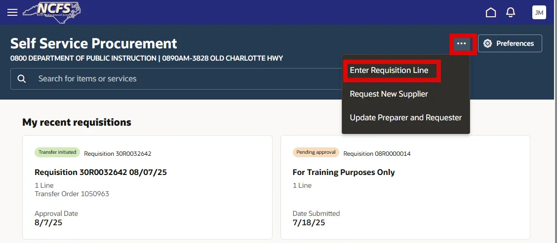 Step 7. Select More Actions (…) in the upper right corner and then select Enter Requisition Line.
