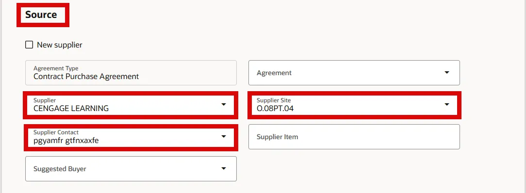 Step 10. In the Source section, enter/select Supplier and Supplier Site, Supplier Contact will default.