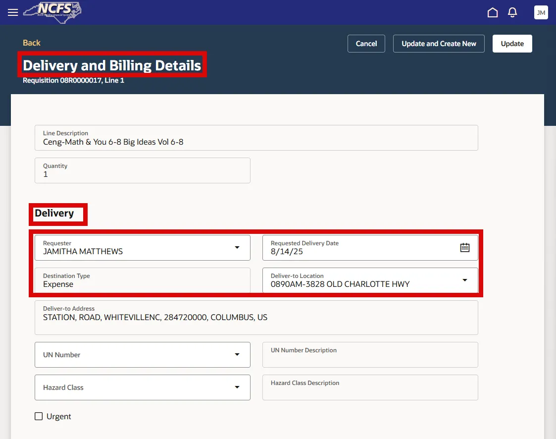 Step 5. In the Delivery section, select the appropriate Requestor, Deliver-to-Location, the Destination Type as Expense.