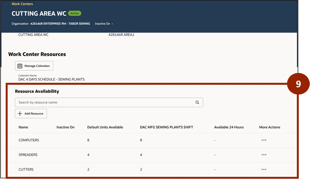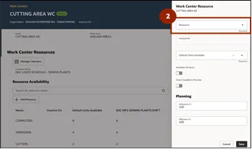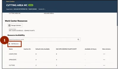 Step 9.    Review the Resource Availability section displaying the number of available resources in the Work Center and the default units for each resource.