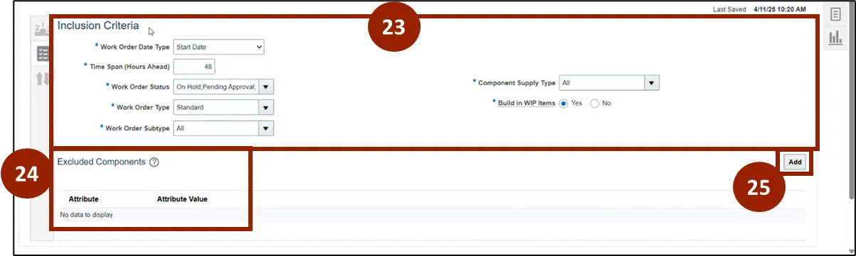 Step 23.    In the Inclusion area, enter information to specific materials or orders that user wants to be able to see when creating rules.