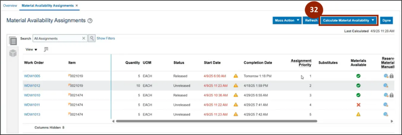 Step 9.    On the Material Availability Assignments page, take note of the last time these assignments were calculated.