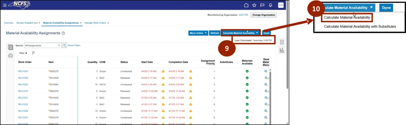 Step 10.    Click on Calculate Material Availability to get the most up-to-date information.