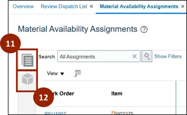 Step 12.    The second tab provides a focused view of Material Availability Assignments for each raw material, showing how individual materials are allocated across various Work Orders.