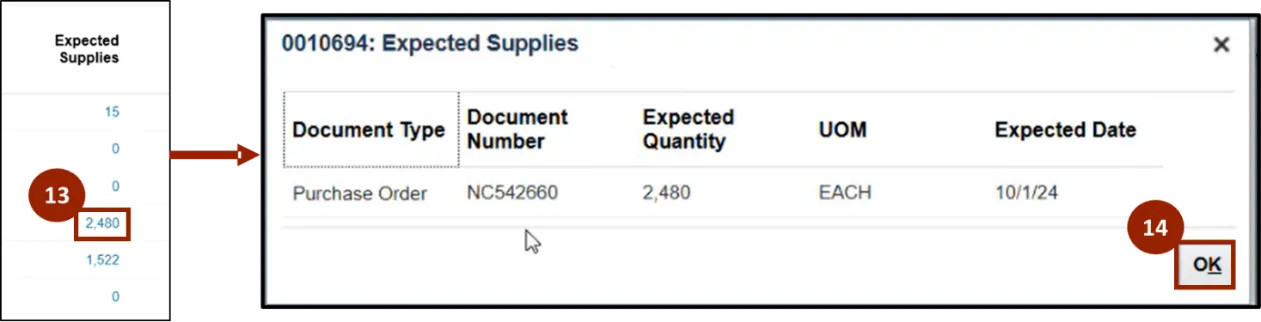 Step 13.    Click the number in the Expected Supplies column, a pop-up will appear with more information.