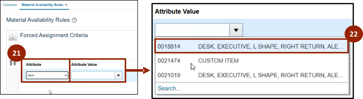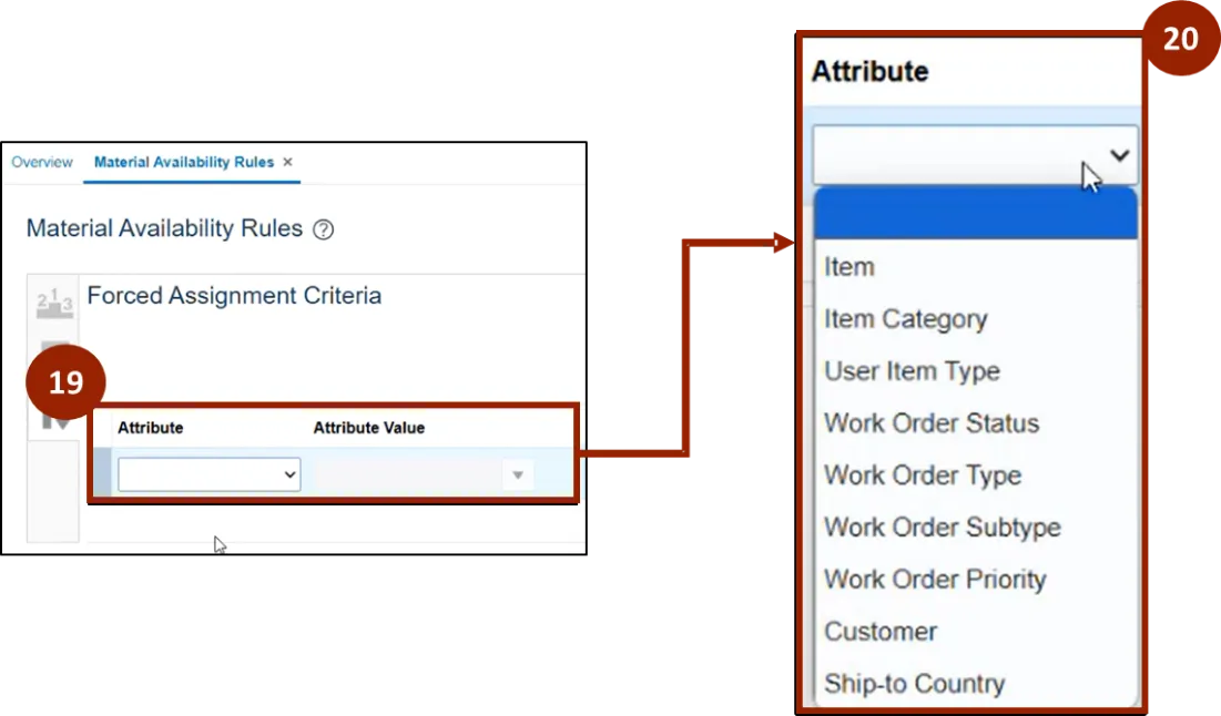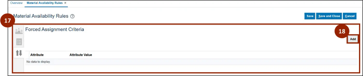 Step 17.    Navigate to the Forced Assignment Criteria tab. This is where users can create rules affecting the assignment of materials for Work Orders.