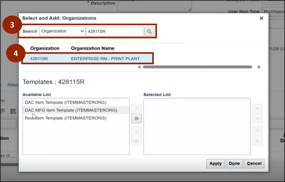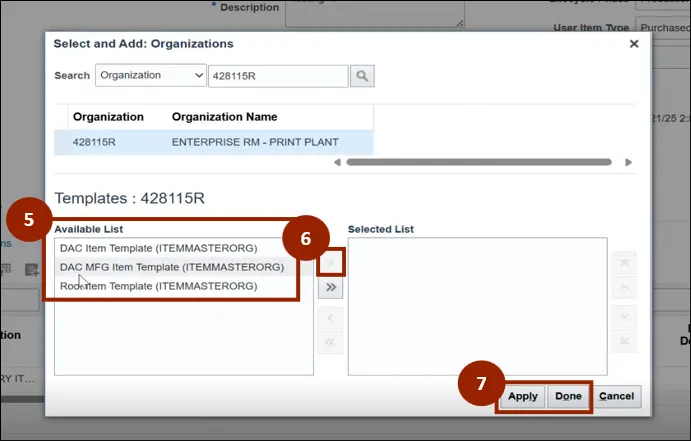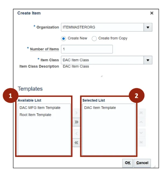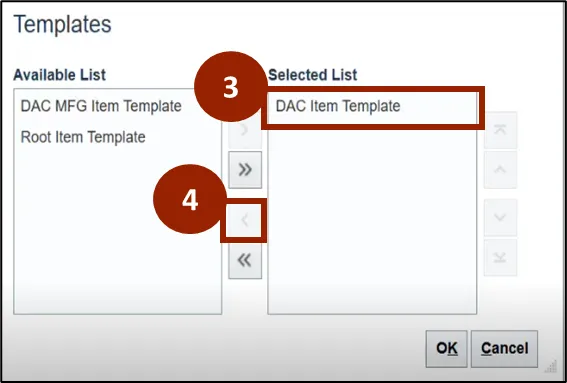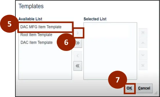 Step 5. Within the Available List, select the Item Template you would like to move (i.e., DAC MFG Item Template).