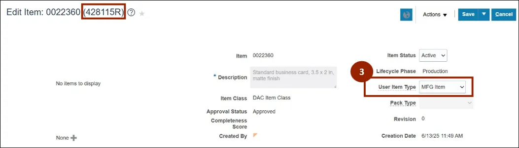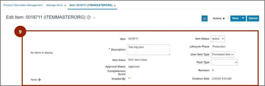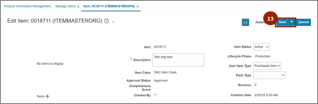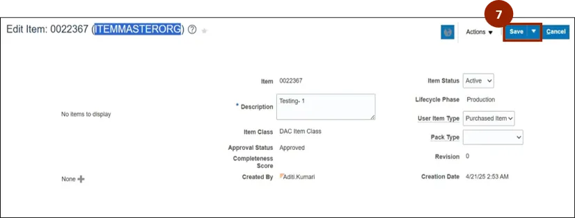 Note: The item currently displays as ITEMMASTERORG, highlighted below. Once saved the system will generate and display the Item Number.