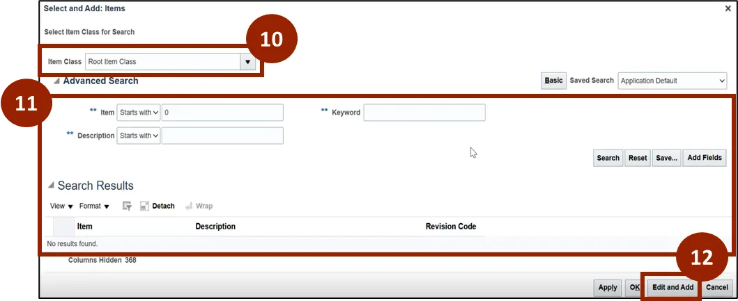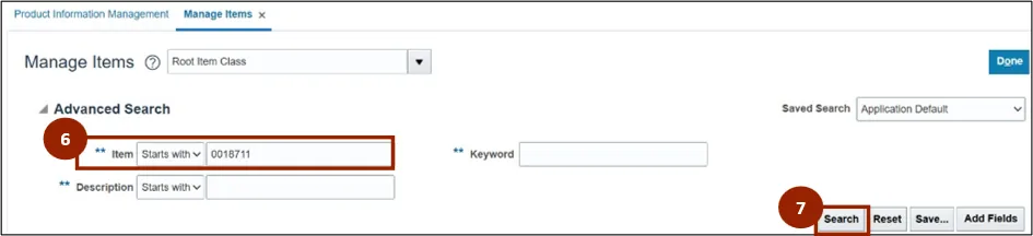 Step 11. Use the Advanced Search fields to search and select a specific Item from the Search Results (e.g., Item 0002400).