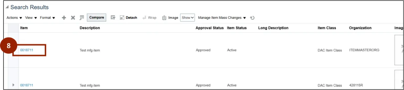 Note: In the Search Results, multiple records may appear—one for the ITEMMASTER ORG and others based on plant associations. Pay close attention to the Organization and Item Status columns, as these areas will indicate whether an item is active or inactive and display the relevant plant information. Carefully review each of the results before selecting an item to update.