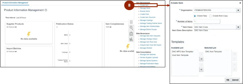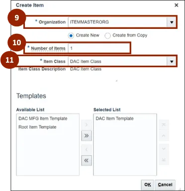 - DAC Item Template is typically the default Template selected. It is used when creating items at the ITEMMASTERORG level and creating any buy items from a DAC plant.