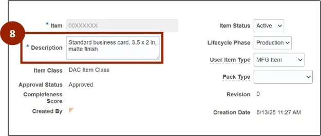 Step 8. On the Create Item screen, enter the item description within the Description field (e.g., standard business card, 3.5 x 2 in, matte finish).