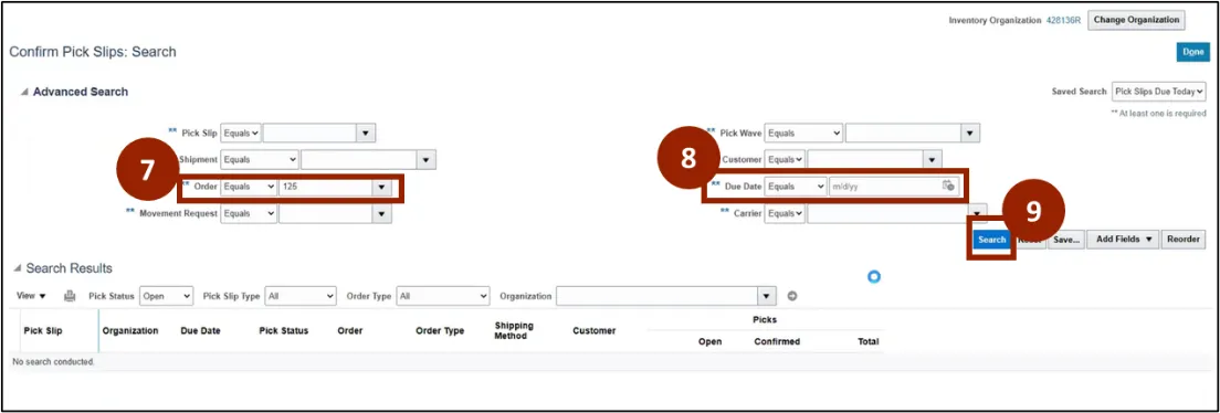 Step 7. On the Confirm Pick Slips: Search page, in the Order field, enter the order number.