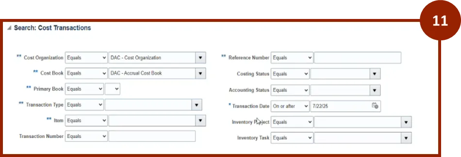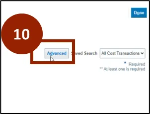 Step 11. On the Search: Cost Transactions screen, input and/or select the appropriate option from the following: