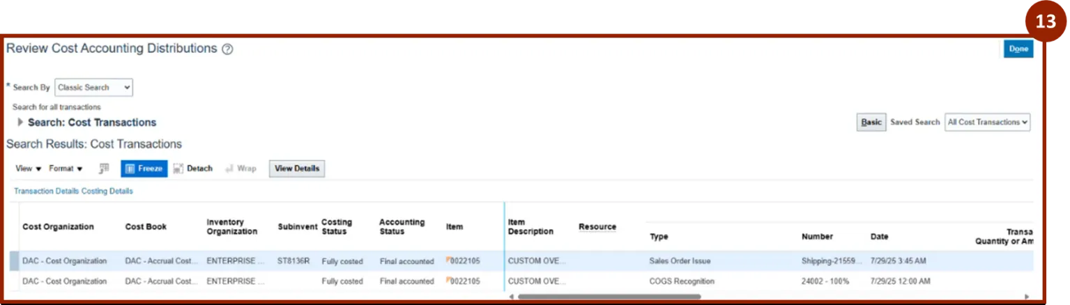 Step 13. Review Cost Accounting Distributions for Sales Order Issue and COGS Recognition.