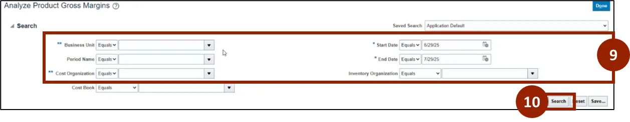 Step 9. Within the Analyze Product Gross Margins screen, select the appropriate dropdown from the following: