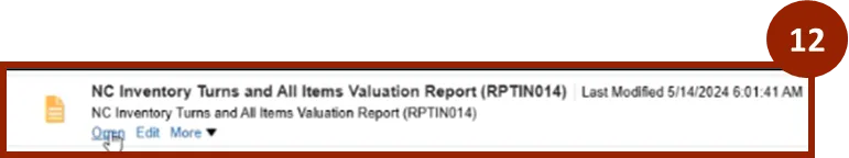 Step 12. Select Open under the NC Inventory Turns and All Items Valuation Report (RPT-IN-014).