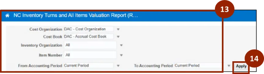 Step 13. On the NC Inventory Turns and All Items Valuation Report, input and/or select the appropriate option from the following: