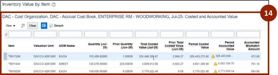 Step 14. The Inventory Value by Item page shows each item's valuation and quantity for the current and prior periods.