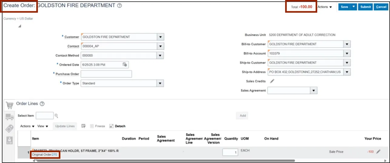 Note: Since this derived from a standard order, the Order Type field is kept the same, this field will change to the appropriate order type once the order is saved or submitted.