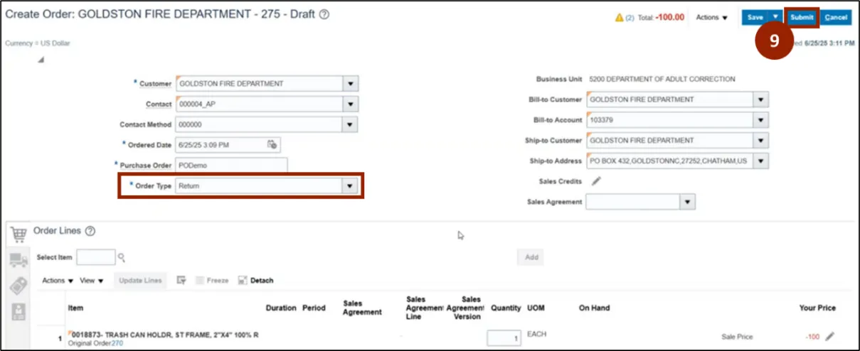Step 1. Enter the Header Details such as Customer, Purchase Order Number and Order Type with Return selected.