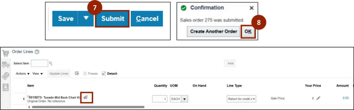 Note: The Create Order screen transitions to an Order screen and a Truck icon displays, indicating that a return has been initiated and the status of the return is reflected in the Status column.