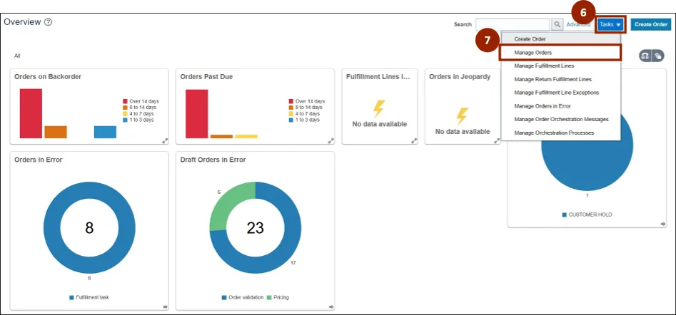 Note: The Order Management Overview screen displays information visually, providing data for DAC. As orders are created and progress, the diagrams and values will populate on this screen. If it is a new instance, this screen displays with minimal information.