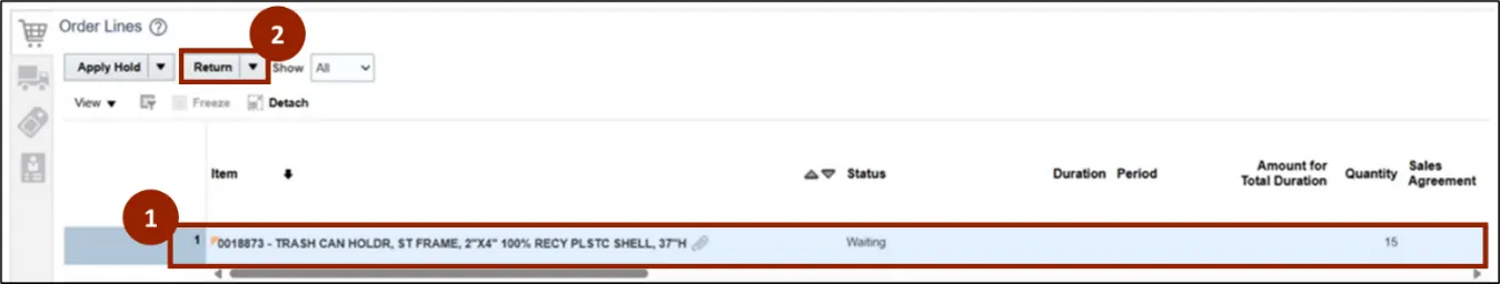 Items that have already been shipped are eligible for the return process. When an item meets the criteria for return, a Return button appears within the Order Lines section on the Order screen.