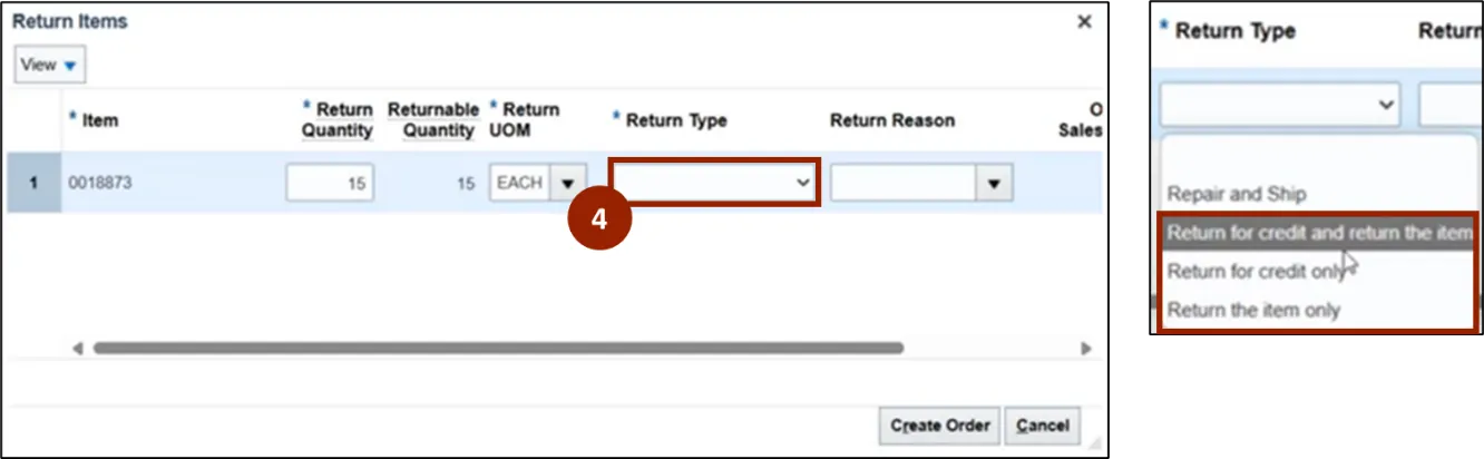 Note: three return options display in the Return Type field list: Return for credit only, Return the item only, and Return for credit and return the item. The Repair and Ship option should only be selected when completing a Repair and Ship order.