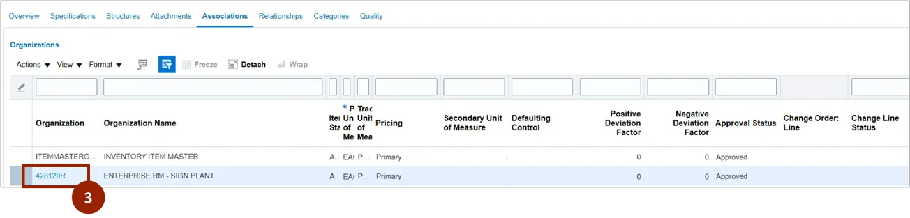 Step 3. In the Organization column of the Associations tab, click the desired organization (or plant) link to open the Item screen for the plant.