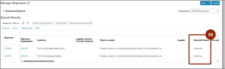 Step 62. The shipments appear on the Search Results screen. Select the shipments that APEX is ready to deliver to the customer.
