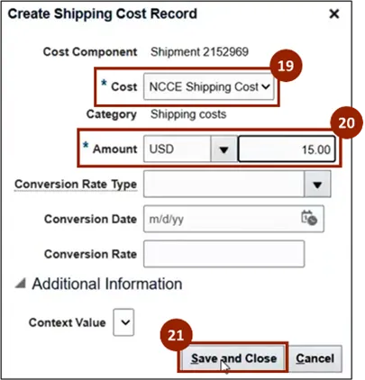 Step 19. The Create Shipping Cost Record pop-up window will appear. In the Cost drop-down, select NCCE Shipping Cost.