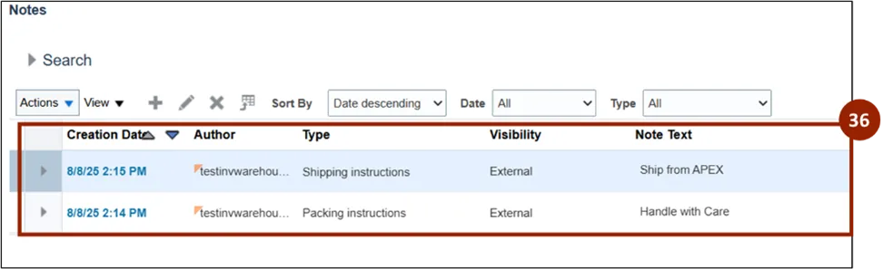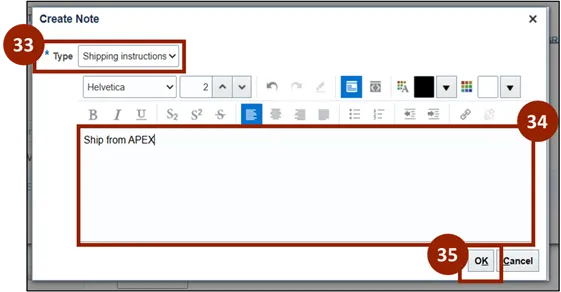 Step 33. The Create Note notification appears, In the Type drop-down select Shipping Instructions.