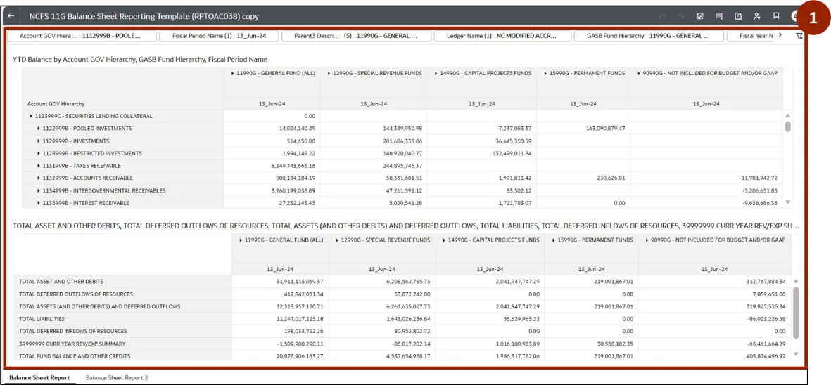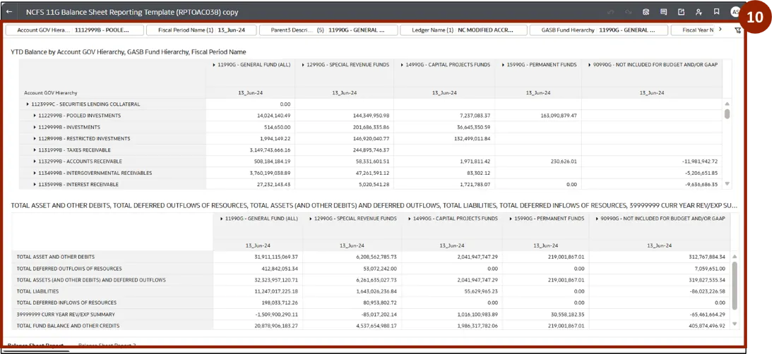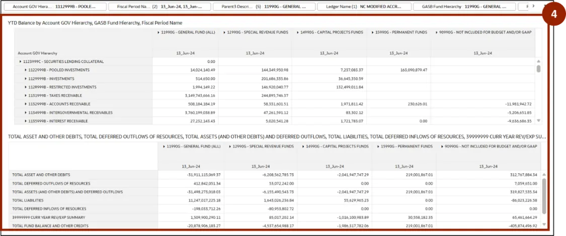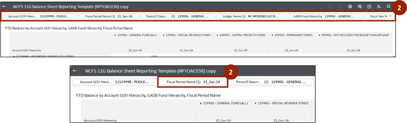Step 2.    At the top of the workbook, all filters are displayed. The user can select the required filter and make changes based on the selected option. In this example, click Fiscal Period Name.