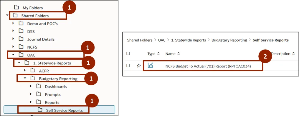 Step 1.    Navigate to the Shared Folders, then open the OAC folder. In the OAC folder, click Statewide Reports and select Budgetary Reporting. In the Budgetary Reporting folder, click Self Service Reports.