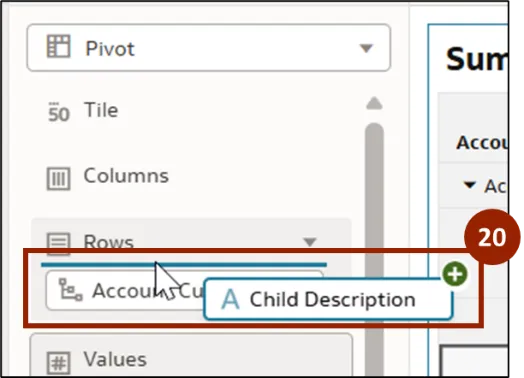 Step 20.    Drop Child Description into the Rows section. Position either above or below the existing row fields, as required by the user’s reporting needs.