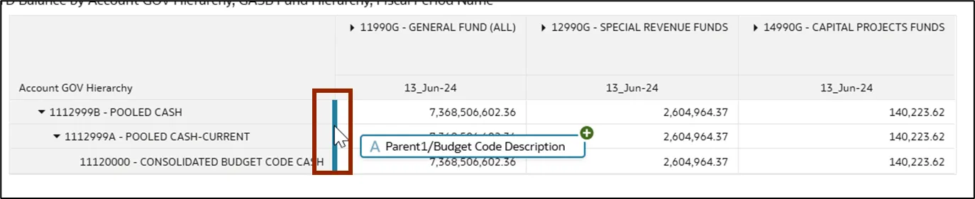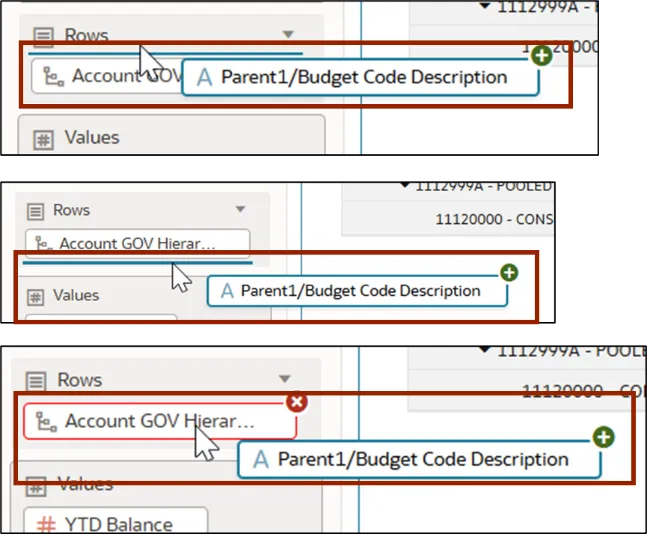 Step 23.    Drop Parent1/Budget Code Description into the Rows section. Position it either above or below the existing row fields, as required by the user’s reporting needs.