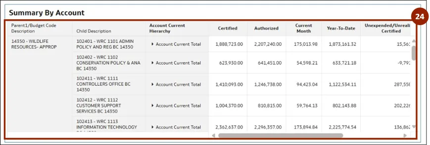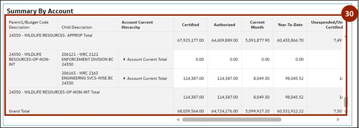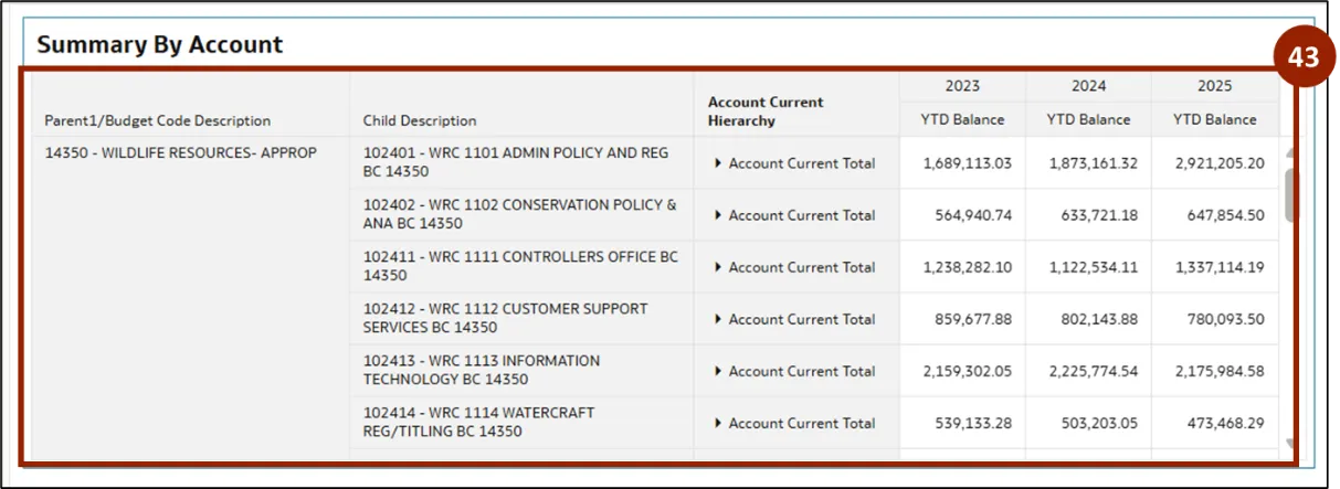 Step 43.    The report is updated to display the selected budget codes, budget funds, accounts, and years, providing a detailed breakdown of salaries by account.