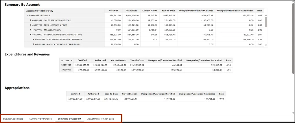 Note: The report contains several tabs: Budget Code Recap, Summary By Purpose, Summary By Account, and Adjustment To Cash Basis. Most self-service activities will be performed in the Summary By Account tab.