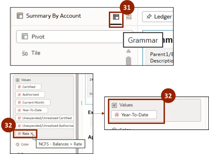 Step 31.    Next, the user can analyze the report to display salaries across multiple years. Click the Grammar icon.