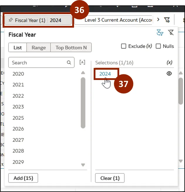 Step 11.    Select the desired year from the list. In this example, select 2024. The selected filter will appear in the Selections section, and the report will automatically update to reflect your selection.