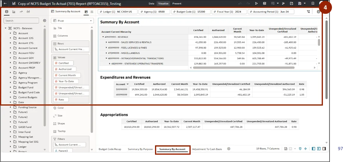 OAC users can manipulate existing reports in OAC DV by following the steps above. Users have the flexibility to filter data, select specific subject areas, and tailor the report to meet their needs. In this example, we demonstrated how to track cash for a particular agency and budget code, empowering users to gain targeted financial insights efficiently.
