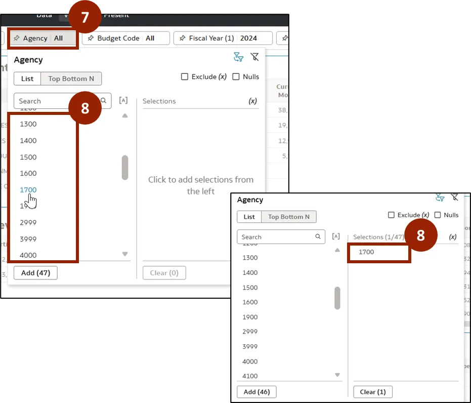 Step 8.    Agency pop-up appears. Select the desired agency from the list. In this example, select 1700. The selected filter will appear in the Selections section, and the report will automatically update to reflect your selection.
