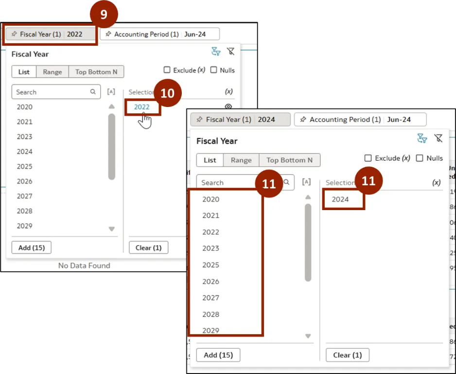 Step 10.    Fiscal Year pop-up appears. In the Selections section, clear any existing applied filter by clicking the relevant selection.