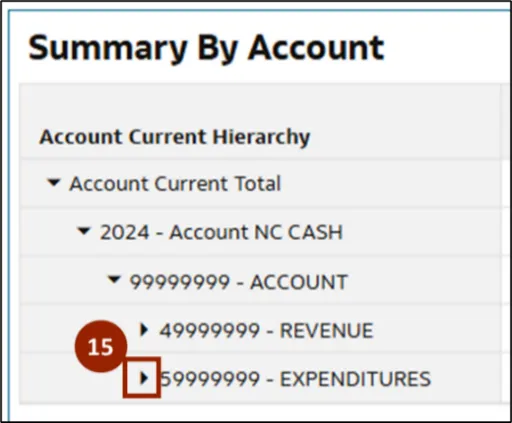 Step 15.    Once the report is automatically updated, click the Caret icon next to 59999999 -EXPENDITURES to drill down and reveal further child accounts.